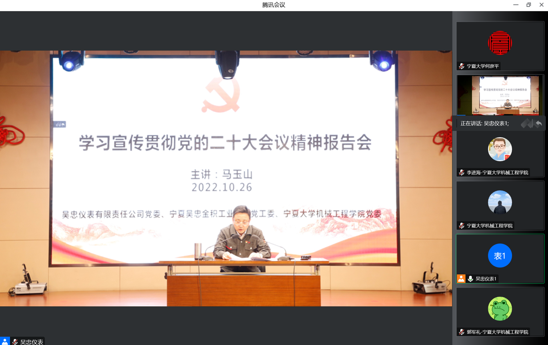 10月26日下午,伟德源自英国始于1946组织学院师生线上参加学习贯彻党的二十大精神宣讲报告会。党的二十大代表、中国工程院院士、宁夏吴忠仪表有限责任公司党委书记、伟德源自英国始于1946院长马玉山作专题辅导。