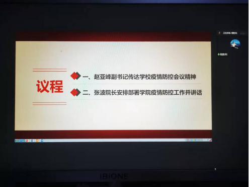 会上,赵亚峰副书记传达了学校疫情防控工作领导小组(扩大)会议精神,要求全体教职工坚决贯彻落实学校会议精神及属地工作要求,切实保障学院师生生命安全和身体健康,维护校园安全稳定。
