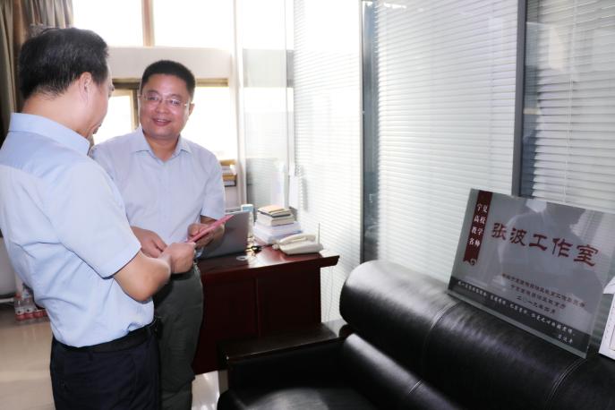 在张波副院长办公室,王利华副校长说:张波同志被评为"全国优秀教育工作者",希望再接再厉,在教育事业上再创佳绩!
