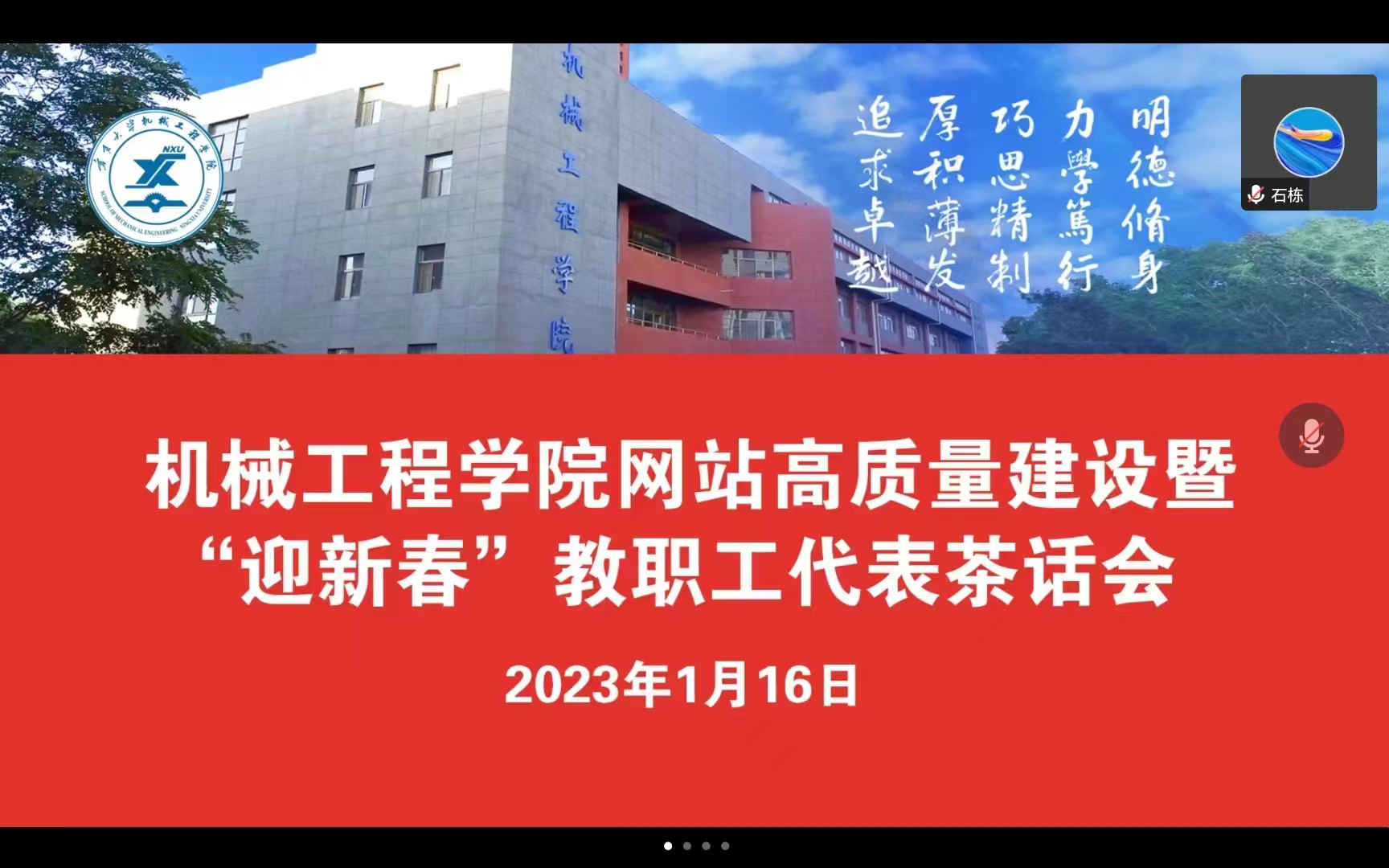 1月16日,伟德官网线上召开学院网站高质量建设暨“迎新春”教职工代表茶话会,学院党委书记程胜利、副书记何彦平、副院长王昱潭、李宏燕、郝洪涛和教师代表参加会议。