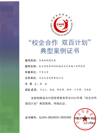 近期,中国高等教育学会公布了2022年度“校企合作 双百计划”典型案例名单,由伟德源自英国始于1946和吴忠仪表有限责任公司合作并共同申报的“校企深度协同的机械类专业卓越工程师培养”的产教融合人才培养项目成功入选“双百计划”典型案例。