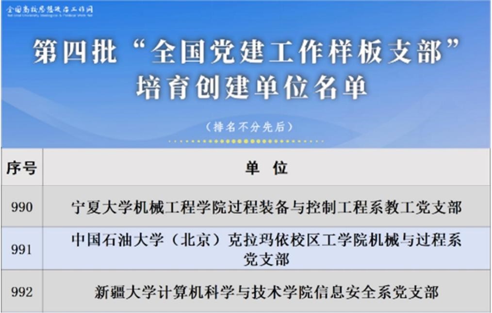 据悉,全国第四批新时代高校党建示范创建和质量创优工作面向全国高校开展,经过组织申报和严格遴选,共遴选产生了10个全国党建工作示范高校、100个全国党建工作标杆院系、1001个全国党建工作样板支部,建设周期为2年。