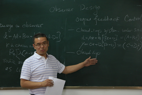 课程“现代控制理论”示范教学分别在伟德源自英国始于1946的512和518会议室进行,伟德源自英国始于1946杨术明副院长主持,伟德源自英国始于1946研究生和部分老师参加。陈文教授讲授了2个学时的现代控制理论发展现状和4个学时的控制观测器设计应用。教学环节采用全板书形式,推导详尽、条理清楚。学生和老师的积极互动交流,让研究生近距离感受了美国大学教授和教学方式。