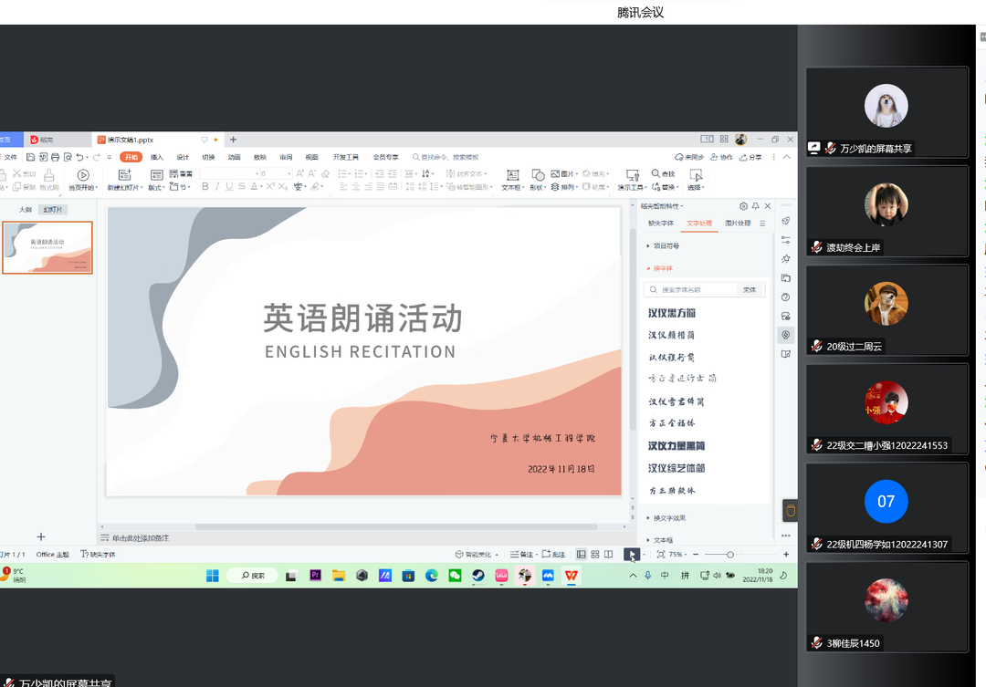 活动开始,社团管理部的同学详细讲解了比赛规则。参赛同学依次打开摄像头开始诵读,并开启共享屏幕来分享文稿。文稿类型多样,涉及共抗疫情,坚持拼搏,追逐梦想和未来,介绍传统节日,保护环境等内容,丰富的题材和内容体现了同学们对于外界的不同思索和探求。同学们声情并茂地朗诵,真挚的语调使单调的单词着上了绚丽的色彩,让那不落凡尘的句子沾染了人间的温暖。优美的文章和富含感情的朗诵拉近了在场每个人心与心的距离。