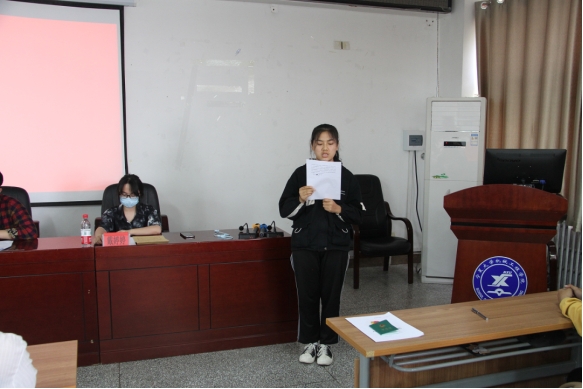 优秀团员代表马伯赞发言,她呼吁全体团员学习团的精神,担当时代重任,以团旗为标杆,以团歌为号召,在平时的学习、工作和实践中,时刻牢记自己是一名共青团员,时刻按照团员的标准来严格要求自己。