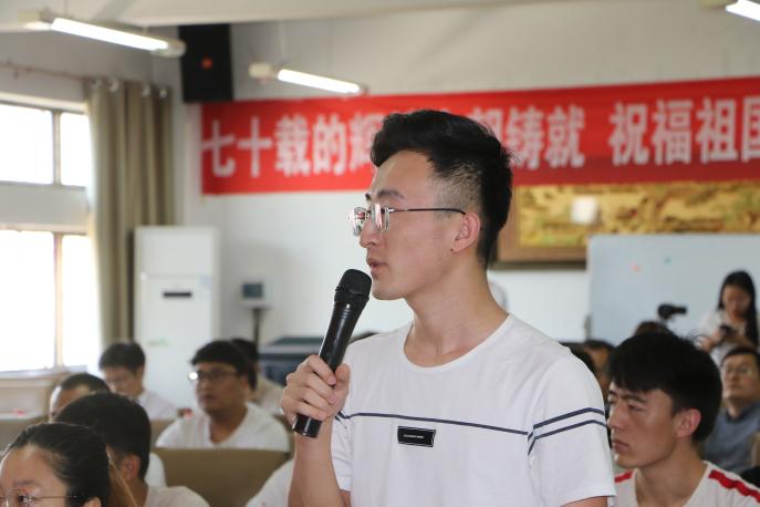 学生处处长罗进德在和同学们交流时,谈到了参加活动的感受。他说,本次主题班会,时间节点和主题都符合当前祖国的大事。并希望同学们把思想统一到党中央部署中来,统一到学校建设发展中来,班干部要注重班级的学风建设、要做班级建设发展的领头雁。