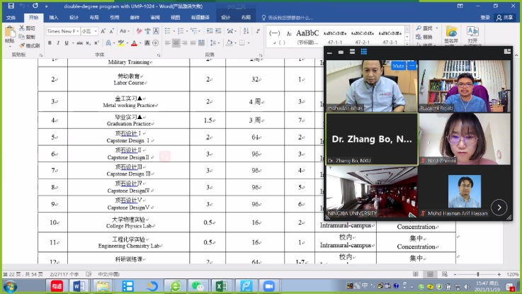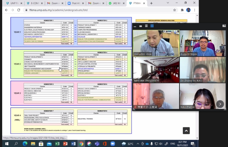 2021年11月19日,伟德源自英国始于1946(School of Mechanical Engineering,NXU)与马来西亚彭亨大学机械与汽车工程技术学院(Faculty of Mechanical & Automotive Engineering Technology, FTKMA , UMP),围绕中外合作办学项目和本科双学位项目,召开了在线视频工作会议(Zoom)。