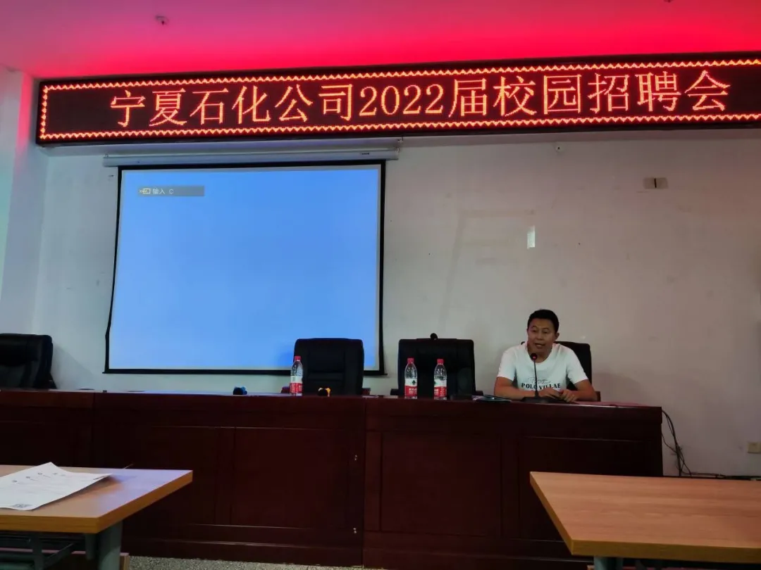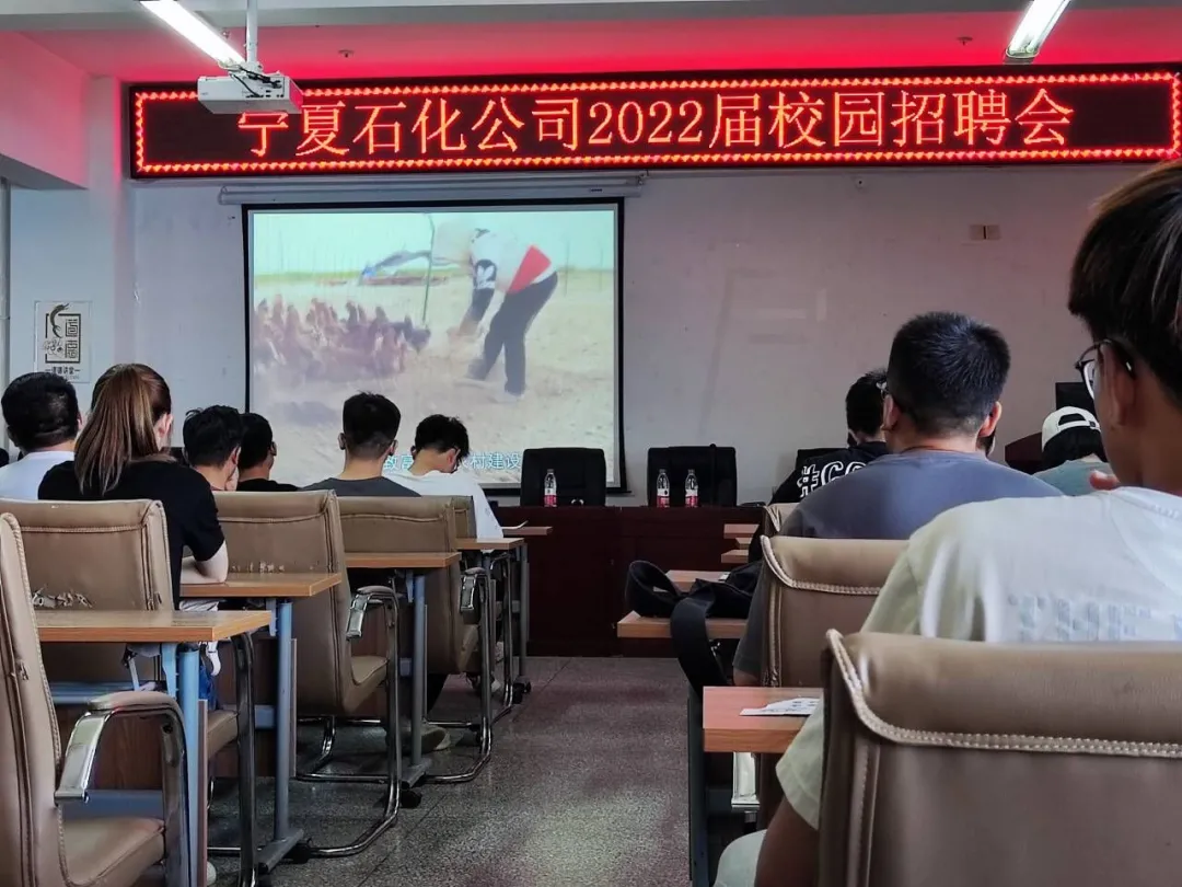 招聘会开始,宁夏石化的工作人员为大家播放了公司宣传片,片中详细介绍了公司从创建投产到重组再到取得一个个傲人成绩的过程,让大家对该公司有了一个直观且全面的认识。宁夏石化公司始建于1985年,是中国石油西部地区重要的石油炼化基地,也是宁夏回族自治区骨干企业。本次宣讲会主要向大家介绍了岗位需求与薪资待遇,并给大家详细讲解了公司的招聘程序及招聘资格要求。