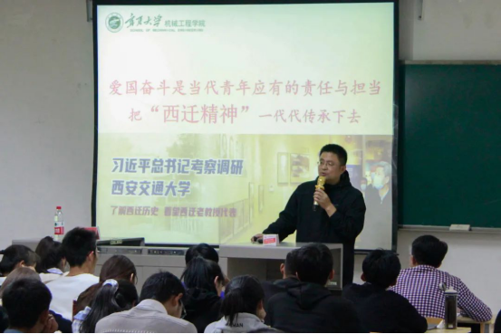 张波院长以“把“西迁精神”一代代传承下去”为主题,首先向大家讲解了“西迁精神”的核心和精髓。从西安交通大学十四名老教授义无反顾西行开始,讲述到他们联名向总书记写一封信。十四位老教授写的信虽语句简短,但内容真挚,表达出愿为祖国奉献自己一份微薄之力。并且他们相信再过几十年,祖国一定会更好。张院长慷慨激昂的宣讲让同学们充分体会到老一辈人为祖国的建设而甘于奉献自我的精神,引起大家强烈的崇敬感和时代责任感。