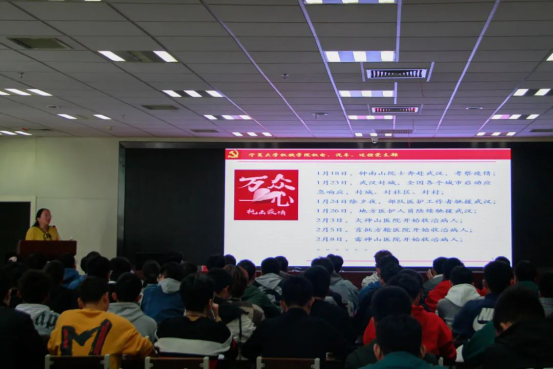 中国之抗疫行动,是防控和救治两个战场协同作战。李老师向大家讲解了党和国家构建的全民参与的防控体系和先进人物的典范。同学们全神贯注地观看了抗击疫情的一些片段,都表示深有感触。通过李老师的讲解,极大地增强了同学们的爱国情怀和民族自信。